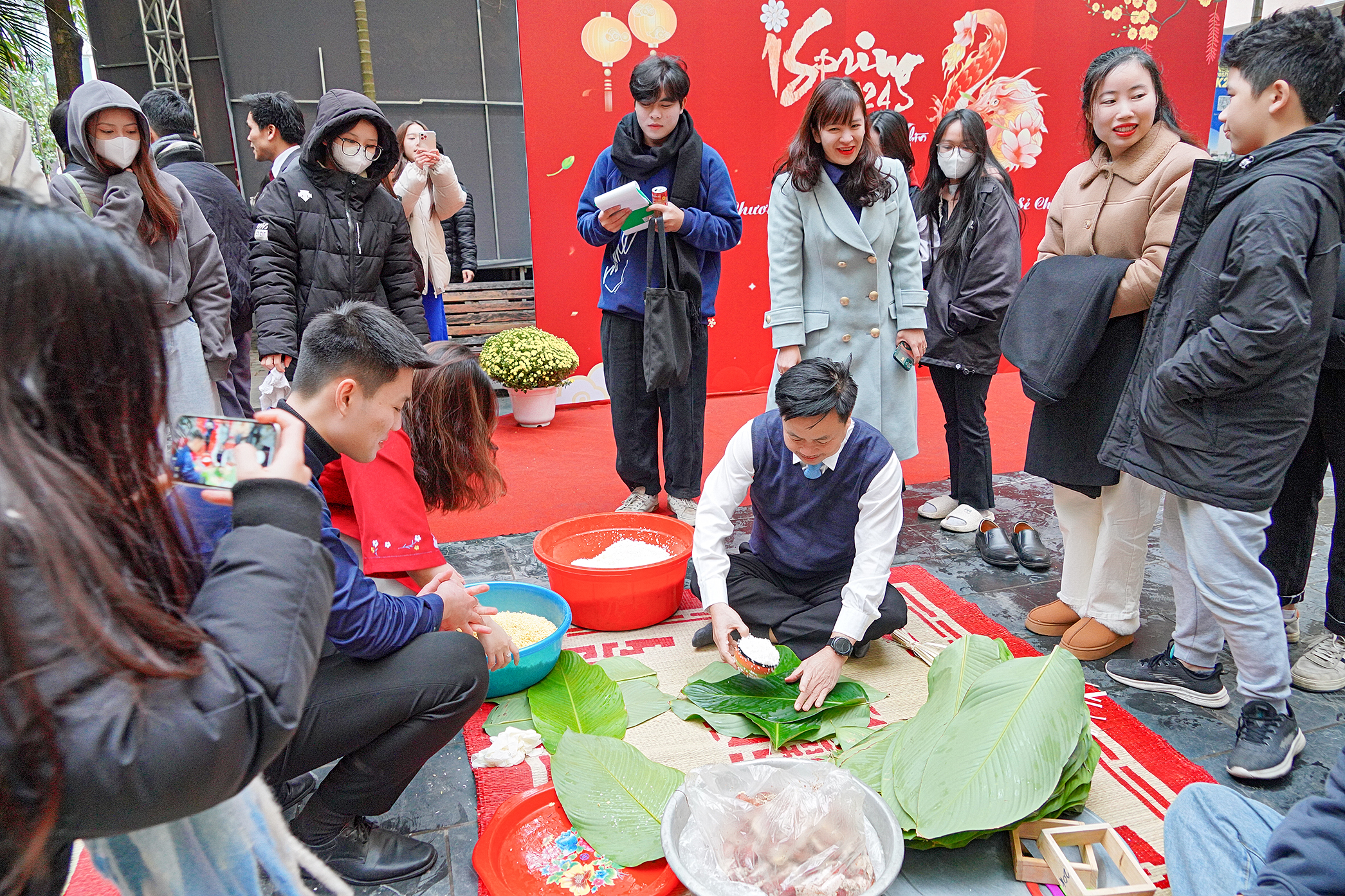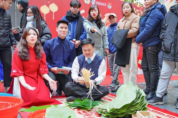 Trong ngày 27/0, gian hàng, khu vực gói bánh chưng, trò chơi dân gian vô cùng sôi động thu hút quan tâm của những người tham gia chương trình. Khu vực gói bánh chưng diễn ra nhộn nhịp với sự hỗ trợ nhiệt tình của các nghệ nhân gói bánh là cán bộ, giảng viên Trường Quốc tế. Các bạn sinh viên ban đầu còn bỡ ngỡ nhưng sau đã quen tay hơn, gói thành thạo hơn nhiều. Những chiếc bánh xinh xắn sẽ được lên bếp trong hôm nay để kịp mang đi khắp nơi chia sẻ đến những người có hoàn cảnh khó khăn đang mong chờ một Tết Đong Đầy. Tại Hòa Lạc, tối 26/1, nồi bánh chưng đã liu riu trên bếp hồng giữa trời đông giá rét. Lạnh nhưng ai cũng thấy vui vì được hưởng không khí tết sớm và được chia sẻ tình yêu thương đến nhiều người.