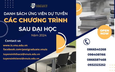 Thông báo Danh sách ứng viên dự tuyển các chương trình sau đại học do ĐHQGHN cấp bằng tại Trường Quốc tế đợt 1 năm 2024 03.04.2021 356 Trường Quốc tế thông báo Danh sách ứng viên dự tuyển các chương trình sau đại học do ĐHQGHN cấp bằng đợt 1 năm 2024Danh sách ứng viên dự tuyển chương trình Thạc sĩDanh sách ứng viên dự tuyển chương trình Tiến sĩ