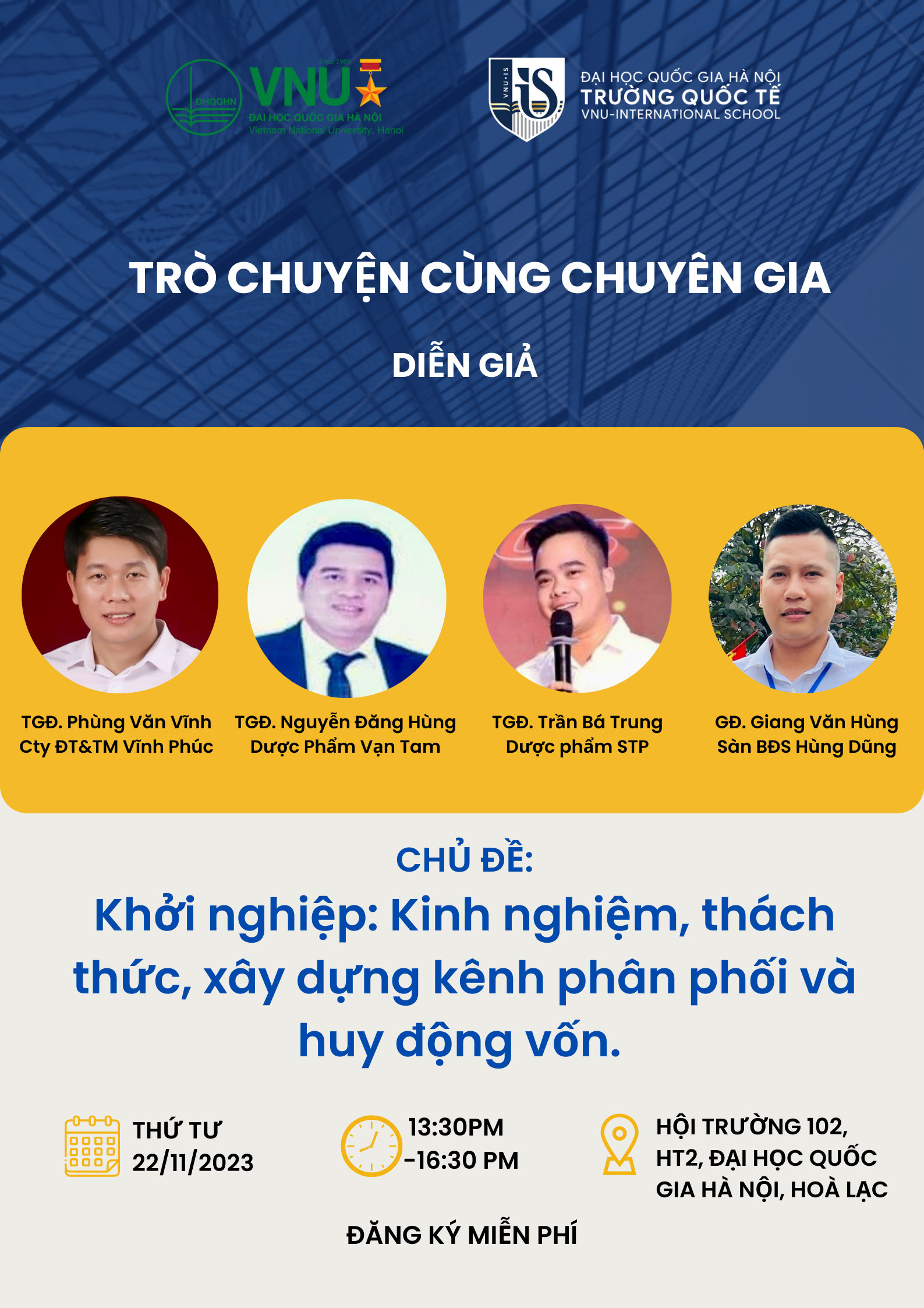 Ngày 22/11/2023, Khoa Kinh tế và Quản lý, Trường Quốc tế – Đại học Quốc gia Hà Nội, tổ chức buổi chia sẻ của các chuyên gia doanh nghiệp với chủ đề “Khởi nghiệp: Kinh nghiệm, thách thức, xây dựng kênh phân phối và huy động vốn”.