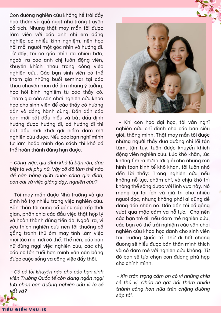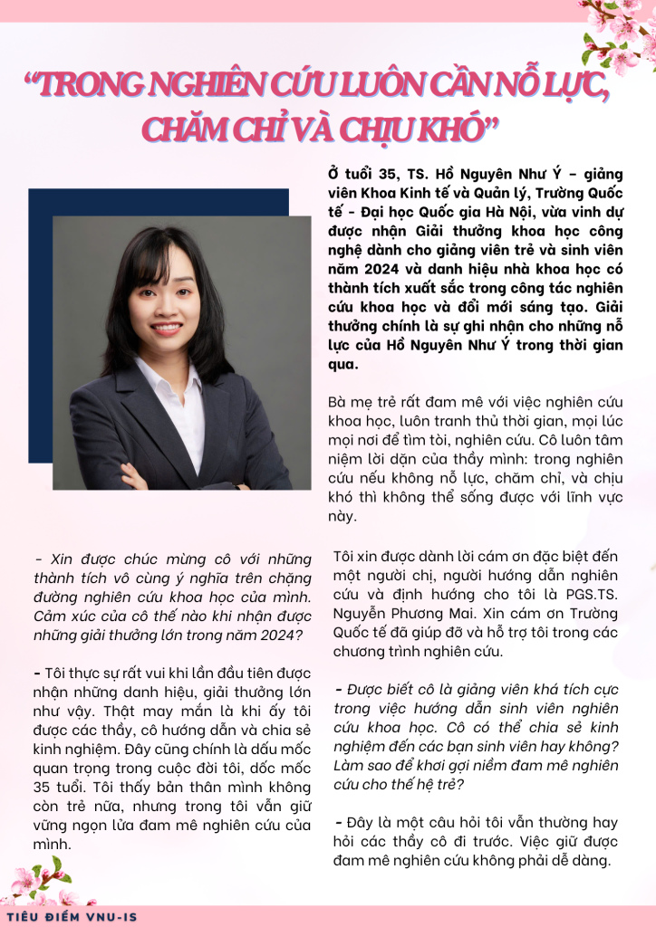 Ở tuổi 35, TS. Hồ Nguyên Như Ý – giảng viên Khoa Kinh tế và Quản lý, Trường Quốc tế – Đại học Quốc gia Hà Nội, vừa vinh dự được nhận Giải thưởng khoa học công nghệ dành cho giảng viên trẻ và sinh viên năm 2024 và danh hiệu nhà khoa học có thành tích xuất sắc trong công tác nghiên cứu khoa học và đổi mới sáng tạo. Giải thưởng chính là sự ghi nhận cho những nỗ lực của Hồ Nguyên Như Ý trong thời gian qua.