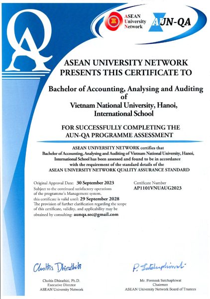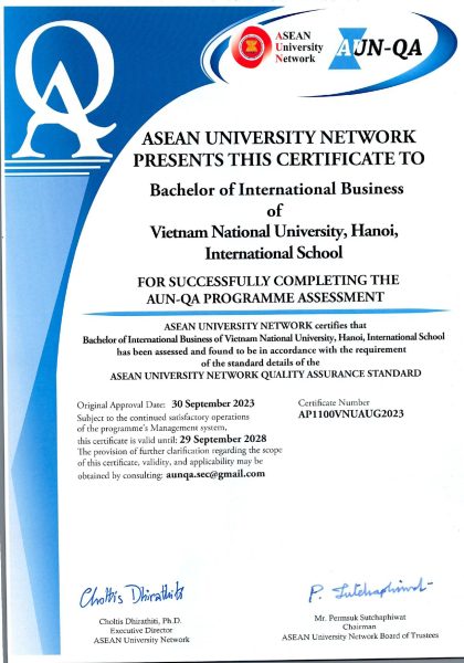 Trong tháng 3/2024, Giám đốc điều hành Mạng lưới các trường đại học Đông Nam Á (ASEAN University Network, viết tắt là AUN) đã thông báo về việc 2 chương trình đào tạo của Trường Quốc tế – Đại học Quốc gia Hà Nội(ĐHQGHN) chính thức được công nhận đạt chuẩn chất lượng AUN-QA (ASEAN University Network – Quality Assurance). Đó là chương trình cử nhân Kinh doanh quốc tế và Kế toán, Phân tích và Kiểm toán. Hai chương trình này được các chuyên gia kiểm định chất lượng giáo dục AUN-QA đánh giá ngoài hồi tháng 8/2023.
