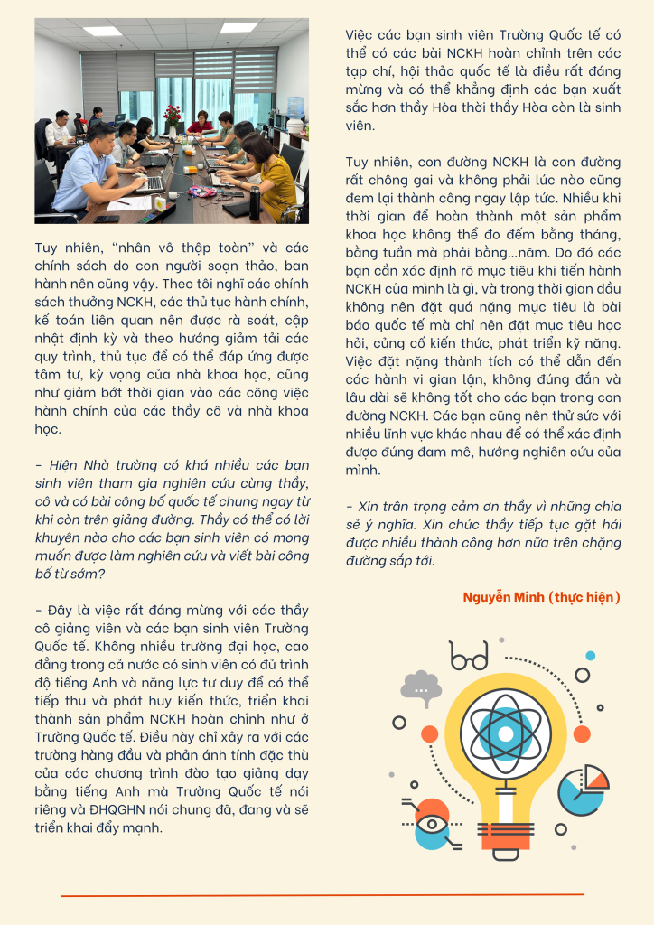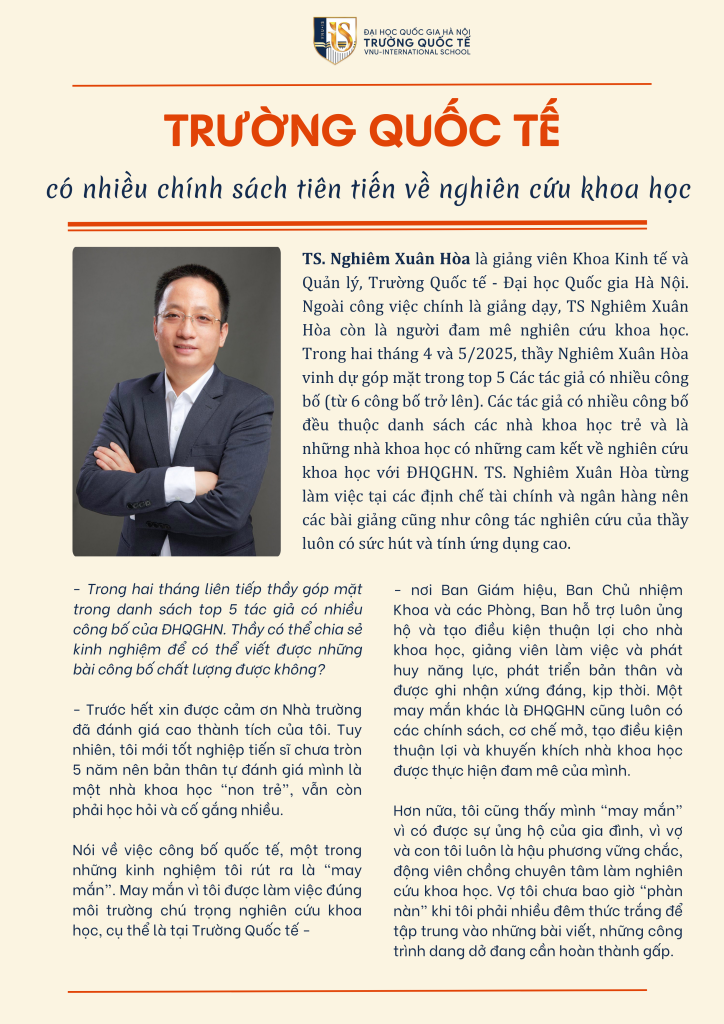 TS. Nghiêm Xuân Hòa là giảng viên Khoa Kinh tế và Quản lý, Trường Quốc tế – Đại học Quốc gia Hà Nội. Ngoài công việc chính là giảng dạy, TS Nghiêm Xuân Hòa còn là người đam mê nghiên cứu khoa học. Trong hai tháng 4 và 5/2025, thầy Nghiêm Xuân Hòa vinh dự góp mặt trong top 5 Các tác giả có nhiều công bố (từ 6 công bố trở lên). Các tác giả có nhiều công bố đều thuộc danh sách các nhà khoa học trẻ và là những nhà khoa học có những cam kết về nghiên cứu khoa học với ĐHQGHN.