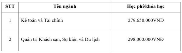 - Mức học phí trên chưa bao gồm học phí học Chương trình tiếng Anh dự bị là 11.165.000 VNĐ/1 sinh viên/1 cấp độ, phí thi lại, phí học lại, phí học cải thiện điểm trong trường hợp sinh viên không đảm bảo được tiến độ, điều kiện và chất lượng của chương trình đào tạo;
