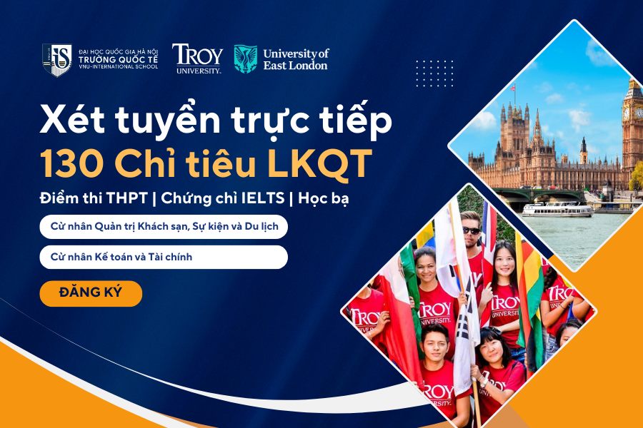 Trường Quốc tế – ĐHQGHN thông báo XÉT TUYỂN TRỰC TIẾP 130 chỉ tiêu theo Kết quả thi THPT năm 2024 của 1 trong 4 tổ hợp A01, D01, D90, D96 đạt từ 20/30 điểm với kết quả môn thi Tiếng Anh đạt từ 6.0/10 điểm hoặc có chứng chỉ IELTS 5.5/TOEFL iBT 72 trở lên vào các Chương trình Cử nhân do Trường đối tác nước ngoài cấp bằng. Cụ thể: