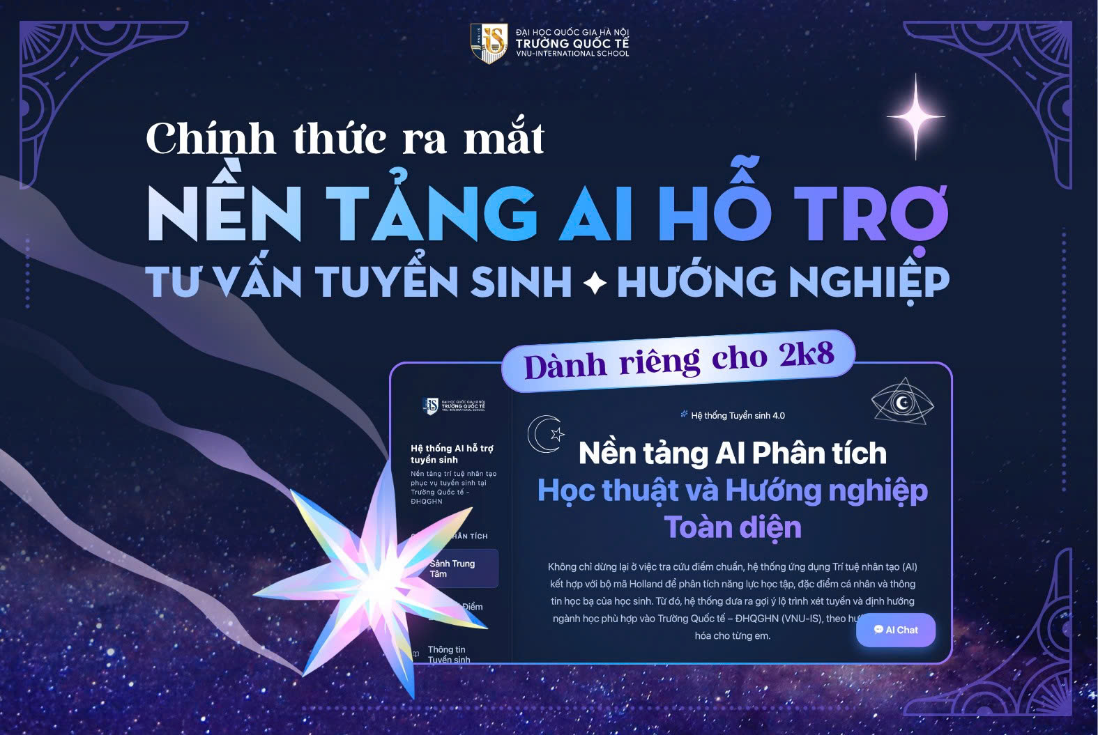 Trường Quốc tế – Đại học Quốc gia Hà Nội đang từng bước khẳng định dấu ấn tiên phong trong chuyển đổi số khi phát triển nền tảng AI phân tích học thuật và hướng nghiệp toàn diện, hỗ trợ thí sinh tiếp cận thông tin tuyển sinh theo cách thông minh, trực quan và cá nhân hóa hơn.