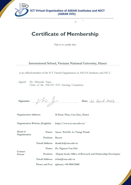 Trường Quốc tế – Đại học Quốc gia Hà Nội (ĐHQGHN) chính thức trở thành thành viên của ASEAN IVO (ICT Virtual Organization of ASEAN Institutes and NICT) từ ngày 22/4/2024. ICT Virtual Organization (IVO) là một tổ chức quốc tế, tập trung vào việc xây dựng mạng lưới hợp tác giữa các viện nghiên cứu và các tổ chức giáo dục chuyên ngành về Công nghệ Thông tin và Truyền thông (ICT) tại khu vực ASEAN.