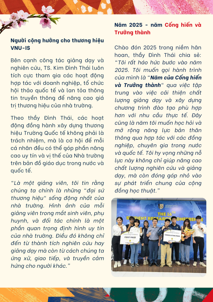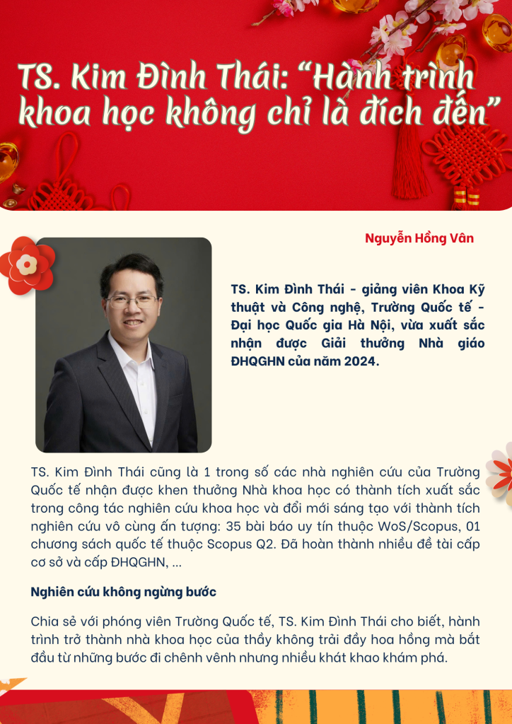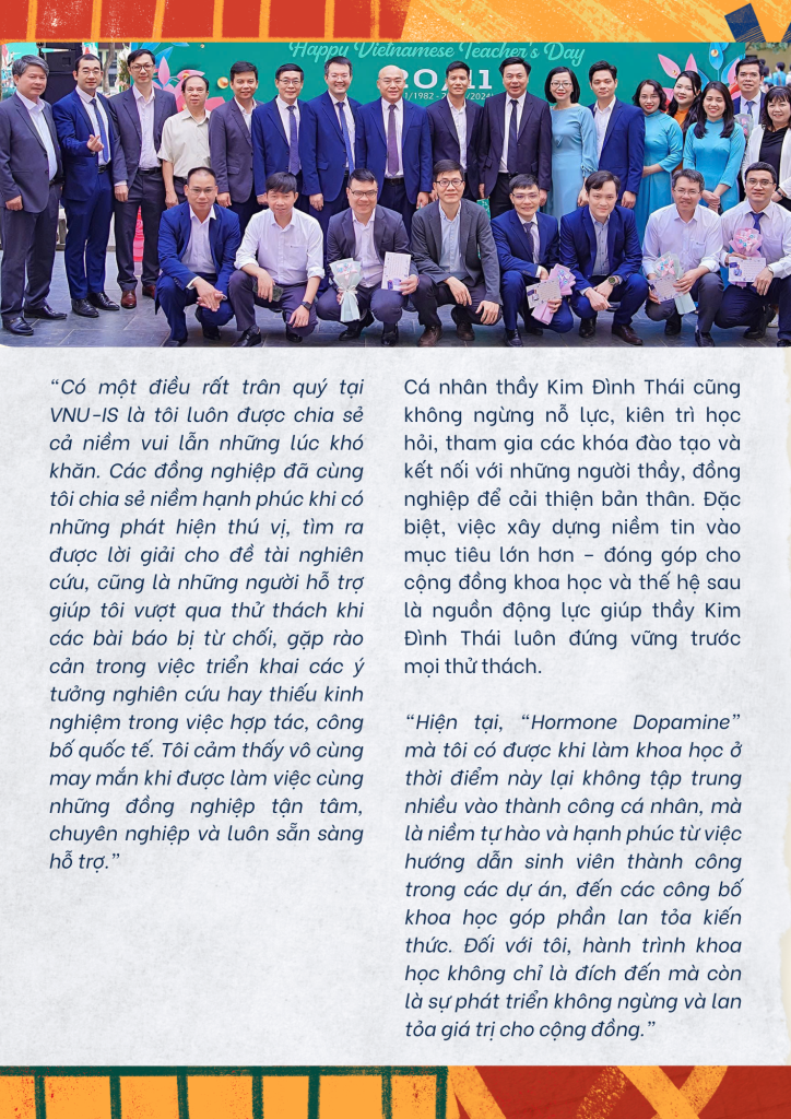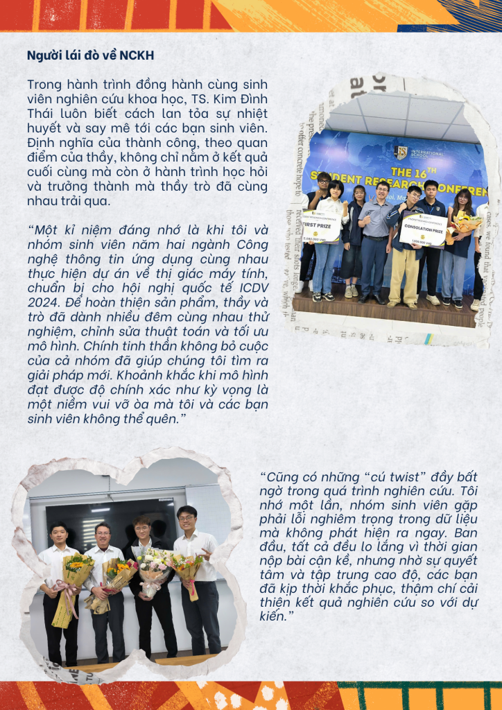 TS. Kim Đình Thái cho biết, hành trình trở thành nhà khoa học của thầy không trải đầy hoa hồng mà bắt đầu từ những bước đi chênh vênh nhưng nhiều khát khao khám phá. Cá nhân thầy Kim Đình Thái cũng không ngừng nỗ lực, kiên trì học hỏi, tham gia các khóa đào tạo và kết nối với những người thầy, đồng nghiệp để cải thiện bản thân.
