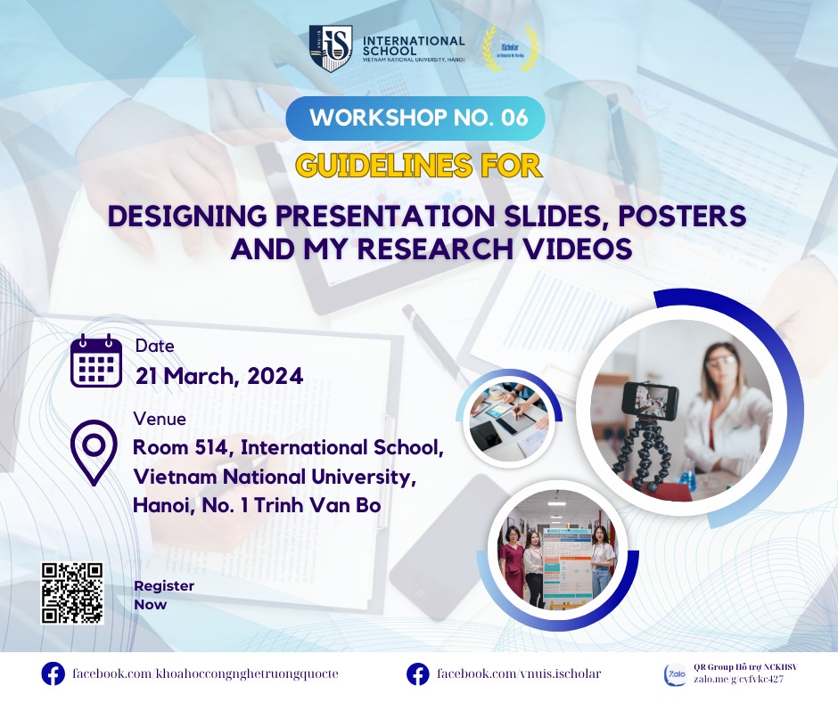 Nằm trong chuỗi hoạt động tập huấn nâng cao kỹ năng nghiên cứu của sinh viên, chuẩn bị cho Hội nghị Nghiên cứu khoa học sinh viên lần thứ 16, Trường Quốc tế – Đại học Quốc gia Hà Nội tổ chức workshop số 06 với chủ đề: “Hướng dẫn thiết kế Slide thuyết trình, Poster, Video nghiên cứu khoa học”.